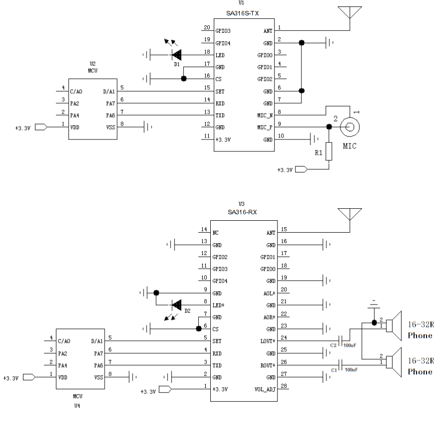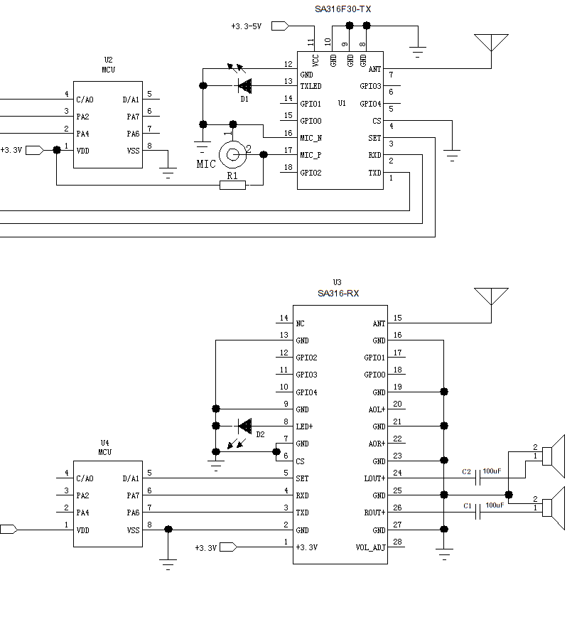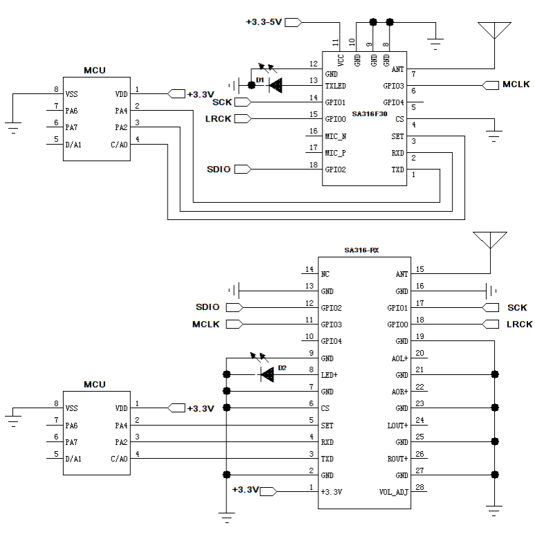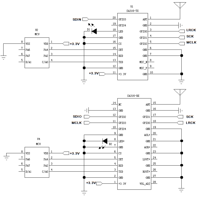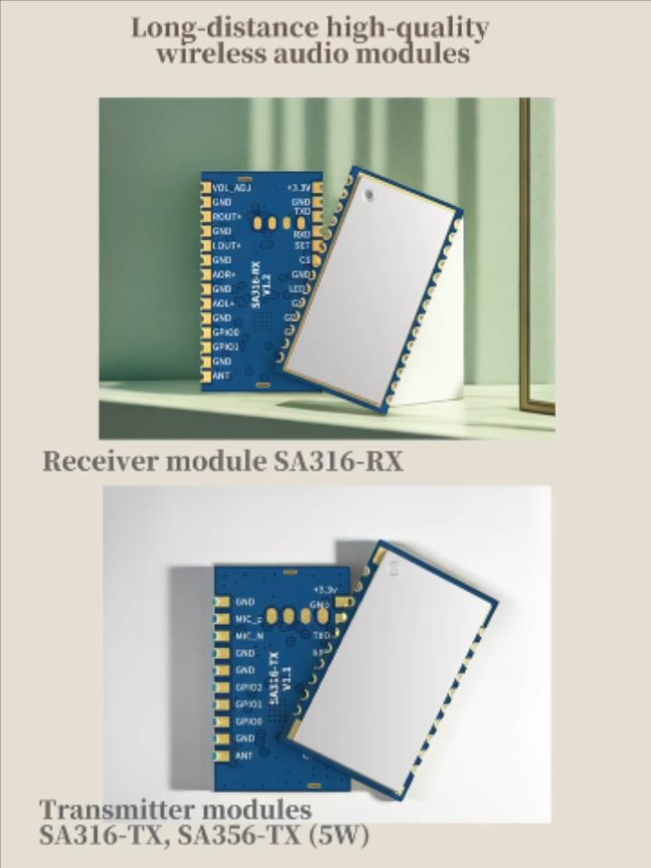 The SA316S series products are divided into transmitter modules SA316S-TX, SA316F30, and receiver module SA316S-RX. This series uses a wireless high-quality voice transmission chip for its design. It can support external PCM / IIS dual-mode digital audio interfaces, and provides customers with a standardized serial interface. Users can quickly and easily set the module's transceiver frequency, volume, microphone gain, and other parameters through serial port commands, which is widely used in situations that require high sound quality.